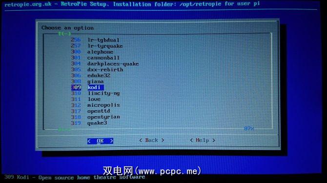 您会在此菜单中找到各种选项,其中大多数是您可以安装的旧视频游戏的开源版本。滚动到 308 kodi ,然后选择确定进入下一个菜单。选择从二进制文件安装开始安装。