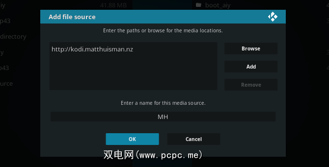 选择添加源文件,选择<无>,然后输入“ http://kodi.matthuisman.nz"(不带引号)。点击确定进行确认,然后输入源名称为 MH 。再次确认(确定),然后返回主菜单。
