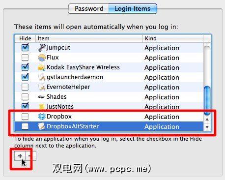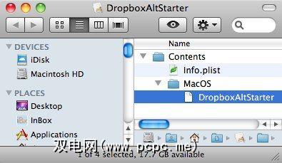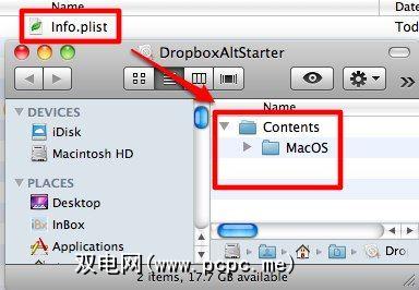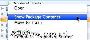 Then open TextEdit and paste: <?xml version="1.0" encoding="UTF-8"?><!DOCTYPE plist PUBLIC "-//Apple//DTD PLIST 1.0//EN" "http://www.apple.com/DTDs/PropertyList-1.0.dtd"><plist version="1.0"><dict> <key>CFBundlePackageType</key> <string>APPL</string> <key>CFBundleExecutable</key> <string>DropboxAltStarter</string> <key>LSUIElement</key> <string>1</string></dict></plist>将文件另存为:“ Info.plist "。