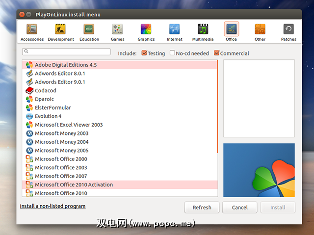 该应用程序提供了App Store类型的界面–浏览并查看是否提供了要安装的应用程序。如果是这样,将指导您完成软件的安装过程。在某些情况下,您需要访问该软件的CD;在其他情况下,PlayOnLinux会为您下载该软件。