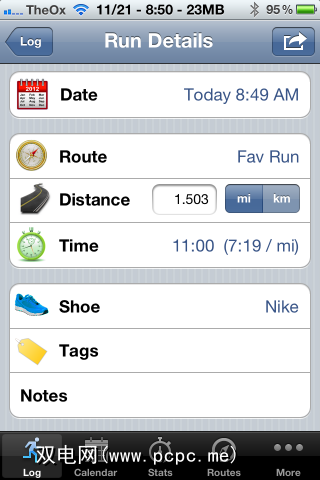 现在,您已经拥有记录跑步的条件。因此,请运行,然后在完成操作后转到“ Log "选项卡,输入您的操作。单击“ +"添加新的运行。点击“ 路线"以从创建的路线中进行选择。它将自动填写距离字段。您记录时间,选择鞋子,然后在需要的跑步中添加任何标签。