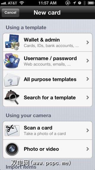 如果在相机支持的iPhone或iPad上使用oneSafe,则该应用程序将包含“扫描卡片"功能,可帮助您拍摄正面照片以及要保存到应用程序的卡片背面。您还可以从设备的相机胶卷导入图像。 oneSafe包含用于保护即时消息,电子邮件和网络帐户的便笺,储物柜组合和密码的模板。