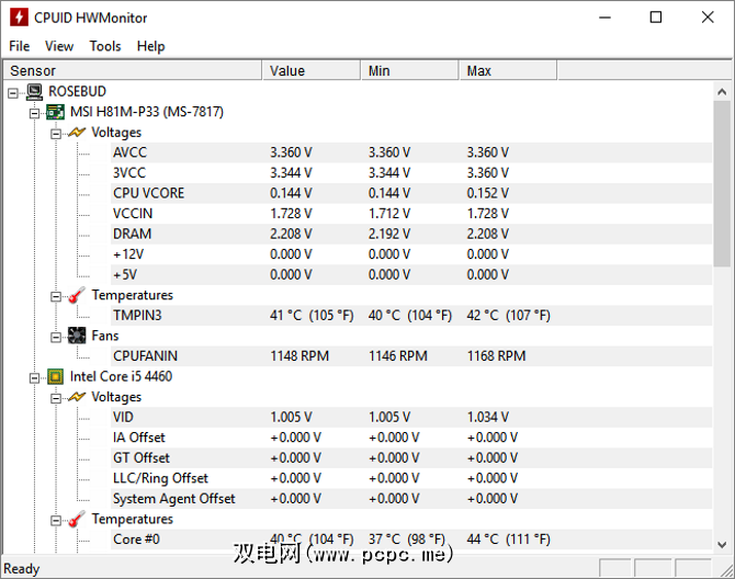 HWMonitor 是一款出色的监控软件,可实时提供最小,最大和当前温度,电压读数,风扇速度,时钟速度等。尽管Afterburner提供了自己的读数,但最好使用多个监视软件来测量您的温度和速度。