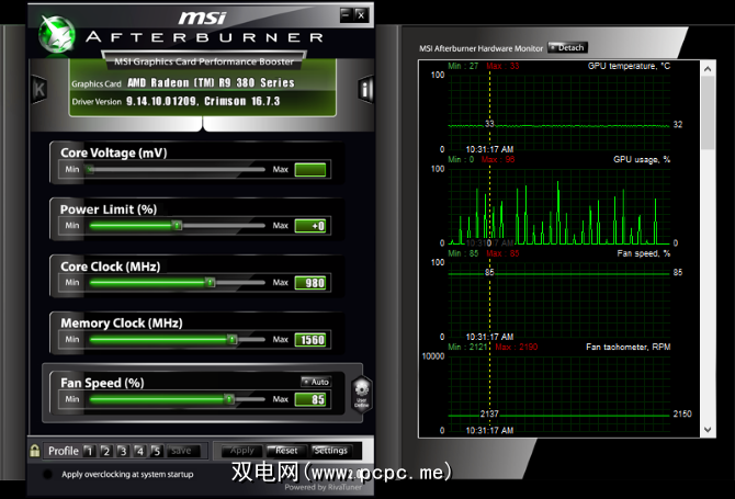 类似的超频工具包括 EVGA Precison X系列和 SAPPHIRE Trixx Utiliity >,尽管Afterburner中提供了这些工具中相同的参数和实用程序。
