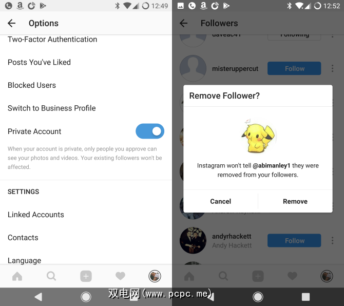 请注意,在任何社交网络中,如果您有任何现有的朋友或关注者想要阻止,则应该这样做。在Facebook上取消好友联系是一种选择,但也可以进行屏蔽。在Instagram上,点击关注者,可以发现谁在关注您。找到您要阻止的关注者,点击右侧的垂直椭圆按钮,然后点击删除。