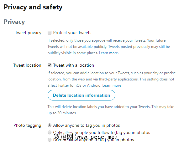 清除对有位置推文的检查,将有助于维护您所在位置的隐私。同时,您还应该选择禁止任何人在照片中标记您的名字,以维护照片的安全性。