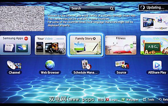 在这里,我们有Samsung ES6500智能电视的主要卖点:Smart Hub。这是ES6500中所有出色功能的中央网关,可以通过按遥控器上的彩色立方体来访问它。在主页上,您将看到用于选择已安装的各种应用程序的选项以及一些标准功能: