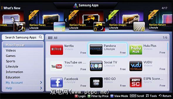 三星ES6500智能电视的应用程序很棒。最后我检查了一下,有超过50种可用的应用程序,而且随着时间的推移,三星肯定会增加更多的应用程序。最受欢迎的似乎是Netflix,Hulu,YouTube,Facebook和Pandora。