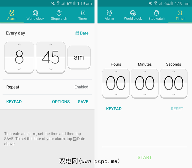 内置时钟/闹钟应用程序有点不同,并且感觉从库存降级了Android应用。滚动时间来设置警报很烦人,而不是直接输入警报。
