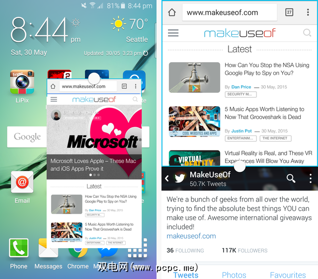 但是,就算这还不够,三星还是采用了另一种形式的多任务处理。如果您从左上角向内下拉,则您所在的应用程序将最小化到一个较小的窗口中,您可以在其中浏览,操作它或将其最小化为一个小图标。左上方的屏幕截图显示了Chrome在主屏幕上运行。可以根据需要调整窗口的大小或移动窗口。
