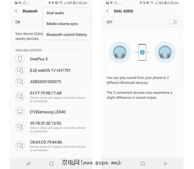 要启用双重音频,请转到设置>连接>蓝牙。首先,在此处将两个蓝牙设备配对。完成后,点击三点按钮,选择双音频并将其打开。