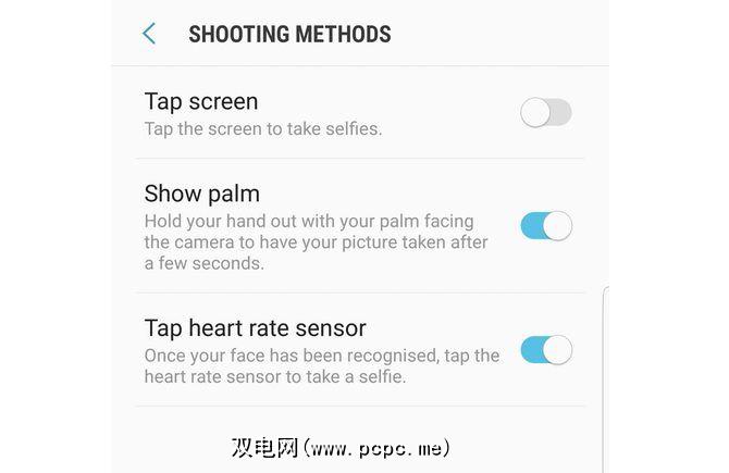 只需打开相机,转到设置,在前置相机下,查找拍摄方法或< strong>拍照方法。在此菜单中,启用点击心率传感器。请记住,只有在取景器中检测到脸部时,该功能才起作用。当您看到脸上的正方形之后,请点击背面的心率传感器以拍照。另外,您也可以从同一菜单中点击屏幕上的任意位置以拍照。