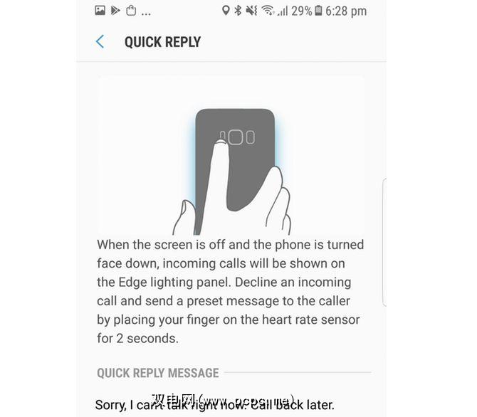它的工作原理是这样的:如果启用了Edge Lighting,并且您将手机正面朝下放置并接听电话,请将手指放在心率传感器上两秒钟,然后通过自定义文字回复功能将通话打消。