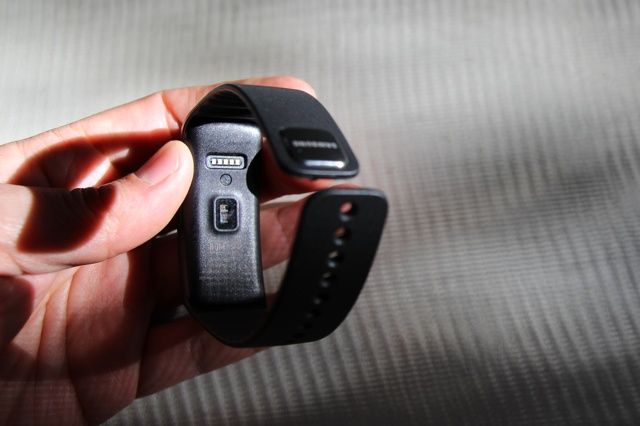 打开Fit的电源后,一个微型的线性电动机颤抖,使整个设备振动。然后,在启动过程中,三星徽标会在矩形表盘上飞溅约9秒钟。设备的后部装有传感器,该传感器发出绿光,在活动时扫描用户的心跳。上方有五个方形螺柱,充电底座可与之连接。