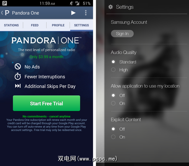 Pandora需要一个帐户才能使用该应用程序,并且该广告中包含可以在每首歌曲之间播放,这是可以容忍的,但是遮盖专辑封面的弹出广告可能会很烦人。值得庆幸的是,有一个名为Pandora One的付费选项,每月只需$ 3.99,即可摆脱广告,为您提供更高质量的音频,访问桌面应用程序,减少“您在听吗?"中断以及针对Web版本的自定义外观。