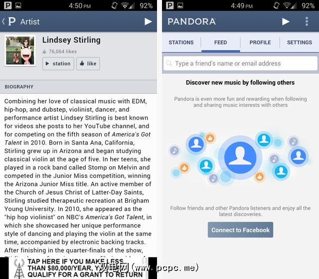 在Pandora上,您的个人资料可以跟踪您的书签和喜欢的内容,并且可以与您的Facebook链接与您的朋友联系的个人资料。您甚至可以追随人们,也可以追随人们,将Pandora带入社交网络领域。