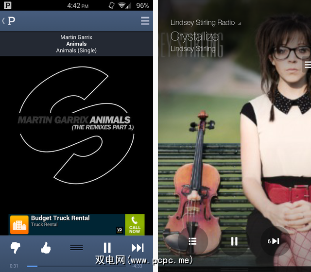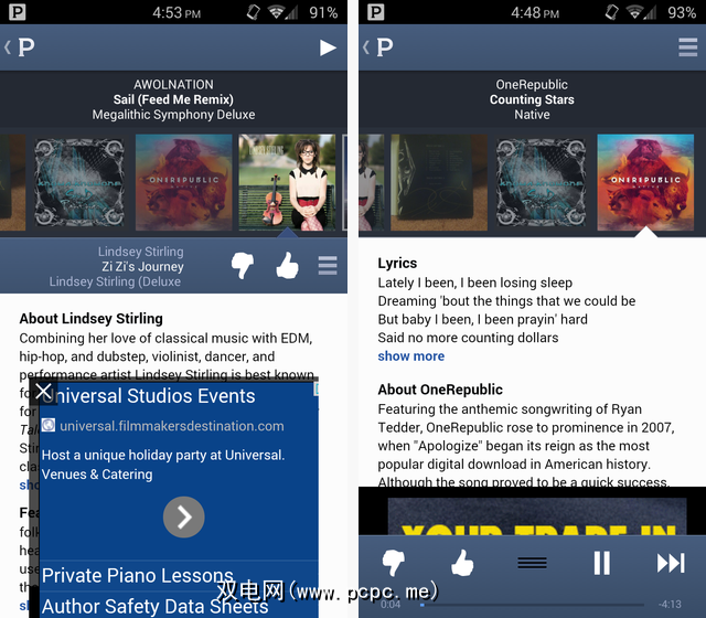 相比之下,Pandora显得混乱,忙碌且毫无灵感。底部有一个带有选项的粗条,顶部也有一个几乎是空的条,将专辑封面限制在中间的小方块中,并被广告部分覆盖。