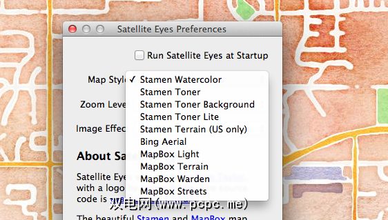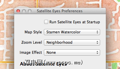 From here you can find the preferences. You can easily set Satellite Eyes to start at boot, if you want, and you can configure how the map looks: