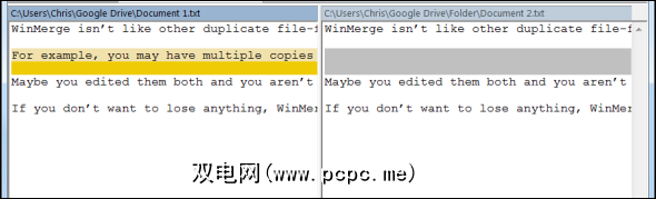 在下面的屏幕快照中,WinMerge注意到左侧文件中包含的句子未出现在右侧文件中。在某些情况下,两个文件都将包含唯一的内容,您可以将它们合并为一个文件。
