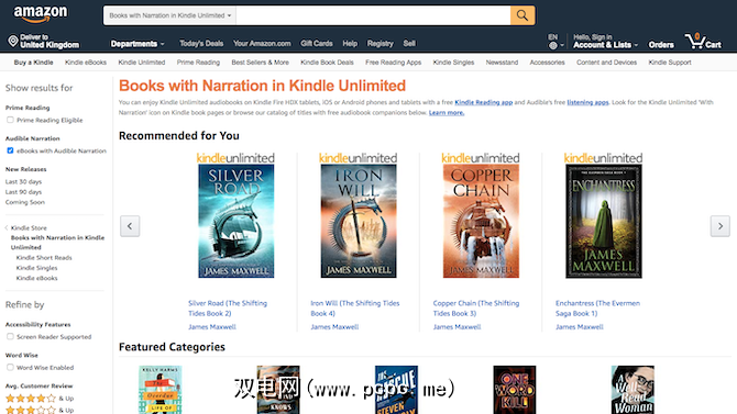 Kindle Unlimited每月收费9.99美元,并且有超过一百万本电子书可供选择。成千上万的标题带有免费或廉价的Audible叙述。在Kindle Unlimited图书旁边查找带有小耳机图标的图书,或者在Kindle Unlimited中浏览“带有旁白的图书"的专用部分。