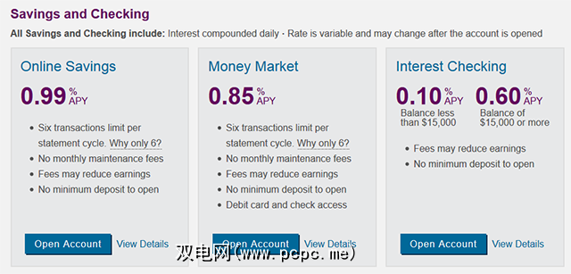 限制::每个结单周期,储蓄账户最多只能进行六笔交易。储蓄账户的APY费率是可变的,而CD账户可能会导致提早罚款。大多数交易需要3-4个工作日来处理。