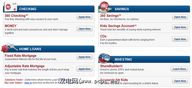 财务利率: Capital One 360提供:CD账户的APY介于0.40%至0.90%之间,按月复利;视您的余额而定,APY在0.20%到0.90%之间的支票帐户;储蓄账户的APY变量为0.75%。其他选择包括抵押贷款以及通过ShareBuilder提供的IRA和投资帐户。