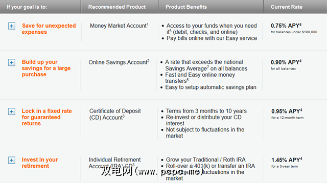 财务利率: Ally提供:三种存款证明(CD),年利率在0.87%至1.30%之间每日计算的百分比收益率(APY);三个个人退休帐户(IRA),年均收入在0.99%至1.30%之间;货币市场账户年利率为0.85%;支票帐户的APY在0.10%到0.60%之间(取决于您的余额);储蓄帐户的APY为0.99%。开设账户没有最低存款要求。