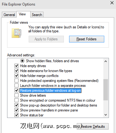 打开“查看"标签并向下滚动直到您会找到一个条目,该条目读取在登录时恢复以前的文件夹窗口。确保选中该复选框,单击确定,您将在下次重新启动时启动并运行。