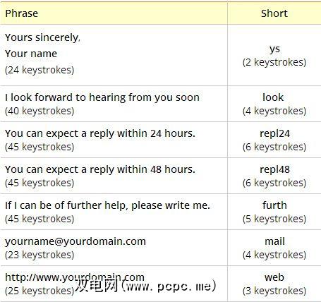 请看上表的第一行。假设键入速度为每分钟60个单词(每秒1个单词),则使用 ys 快捷键最多可以节省20秒。考虑每天大约50封电子邮件的慷慨估计,即1,000秒。将其与许多其他经常重复的短语(例如, repl24 ,进一步,邮件)结合使用,您最多可以节省5900秒或<每天要超过98分钟。