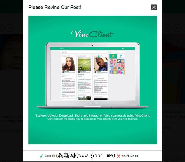 首次运行VineClient时,它会要求您重播视频并关注其帐户。该视频要求人们下载扩展程序,这是一种广告形式。好消息是您可以忽略这些请求。