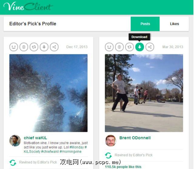 Vine自己的网站并未针对桌面观看进行优化,而是开始自动播放视频,这可能不符合您的喜好。如果您使用的是Google Chrome浏览器,则VineClient是查看和下载Vine视频的绝佳扩展。它在每个视频上方放置一个方便的下载按钮,并在每行中显示三个视频。这意味着在宽屏大屏幕上,您无需滚动即可轻松观看四到八个视频。