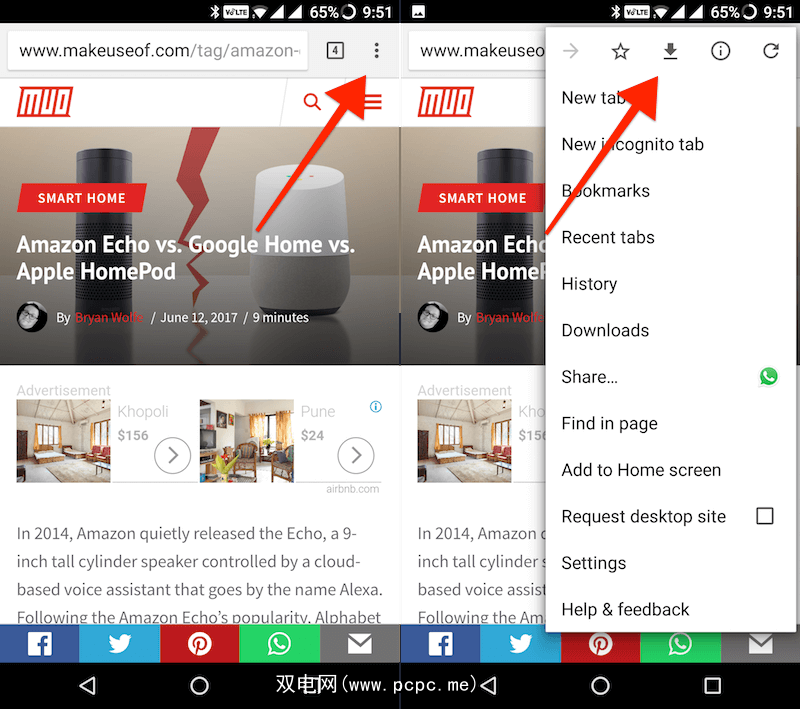 。要返回保存的页面,您需要转到下载部分。在Chrome中,点击三点图标并选择下载。如果您在保存页面后马上回来,则会在列表的顶部看到它。