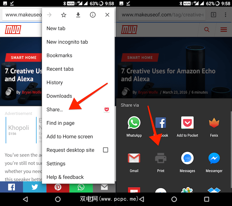 要使用Pocket,请下载该应用并创建一个帐户。现在,转到浏览器并打开要保存的页面。在Chrome中,点击三点图标并选择共享。从此菜单中选择 Pocket 图标。