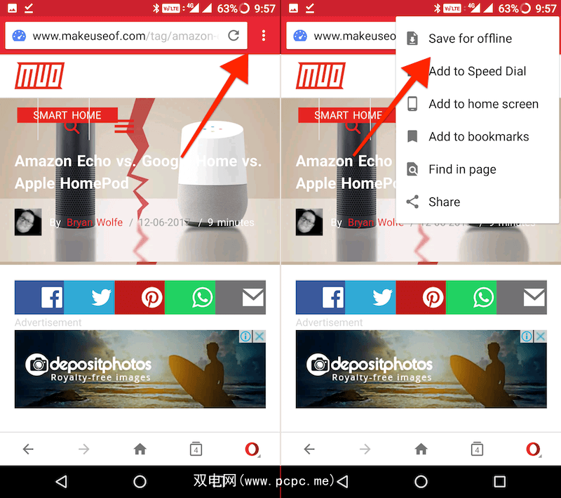 在Opera Mini中打开页面后,点击三点图标并选择保存为离线版本。