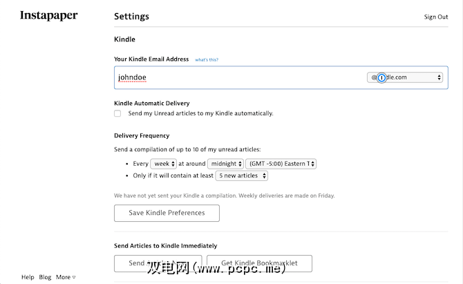 Instapaper具有内置功能,可以集成Kindle帐户。要进行设置,请进入设置,然后在 Kindle 部分下,输入您的Kindle电子邮件地址。接下来,您需要将Instapaper的发件人ID附加到您在Amazon上的批准的个人文档电子邮件列表中。点击保存 Kindle偏好设置,您就完成了。