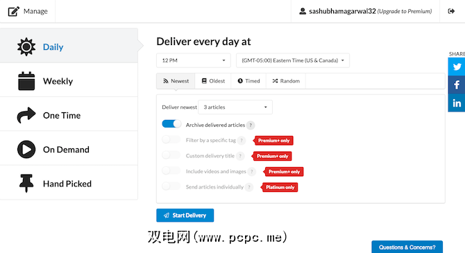 P2K可以每天或每周自动将一些文章迁移到Kindle。代替例程,它使您可以手动拣选和转移工件。 P2K还有另外一些需要高级帐户的特权,例如能够邮寄带有特定标签的文章并创建多个传送系统。