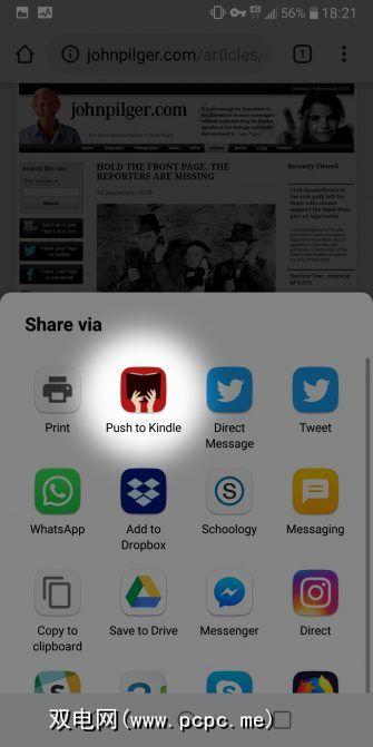 我们之前讨论的扩展程序“ Push to Kindle"具有Android和iOS客户端。当您点击共享按钮时,它会在工作表中显示一个新的Kindle选项。这使您可以从手机上的任何浏览器应用转发文章。就像其他实用程序一样,您必须先打入Kindle和批准的个人电子邮件地址。