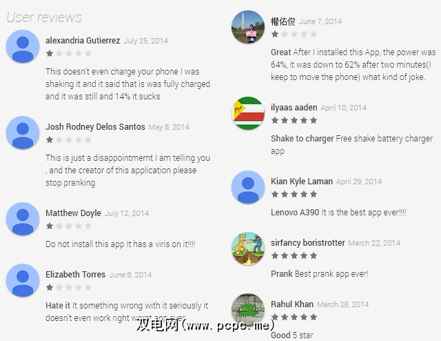 电池续航时间可能会比Android所期望的要短,但是幸运的是,有一些明确的方法可以获取更多的能量。这些应用不是其中之一;摇晃设备如何以任何方式为电池充电?如果可能出现这种现象,则您无需使用任何应用即可利用它。令人惊讶的是,人们似乎并不了解这些应用不是真实的。只需查看一下评论即可: