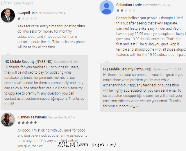 输入NQ Mobile Security&Antivirus,这要求用户付费以更新其数据库!这绝对是荒谬的行为,但该应用程序获得4.4星评级,拥有超过一千万的客户。阅读评论会让您感到难以置信,因为该应用程序具有杀毒软件最重要的功能,而且人们对此评价很高。