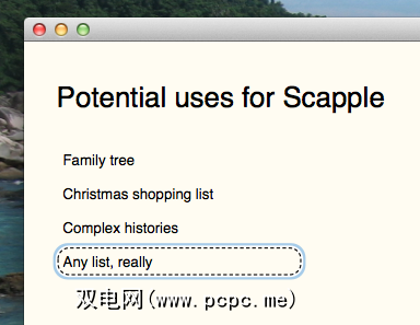 这里的思维优势是显而易见的–将思想彼此联系起来可以真正激发创意。但是与基于Web的思维导图软件相比,Scapple真正与众不同的是它与操作系统的集成。
