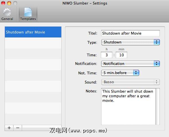 除了基本功能之外,NIWO Slumber还允许您创建大量模板。每个模板都定义了与上述类似的不同计时器。使用这些模板,您只需单击几下鼠标,即可快速重用关闭计时器。