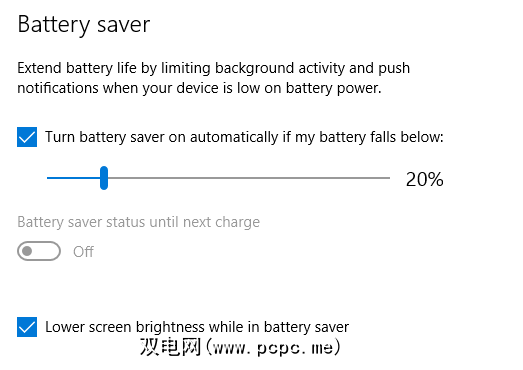 最后,勾选在节电模式下降低屏幕亮度。无法设置使用的亮度级别,但希望微软在将来的Windows 10更新中添加该亮度级别。
