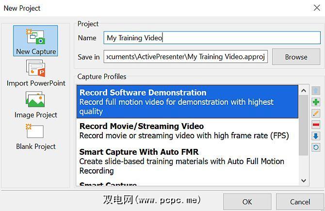 首次启动ActivePresenter时,需要选择一个配置文件类型。 录制软件演示选项以最高质量录制全动态视频。