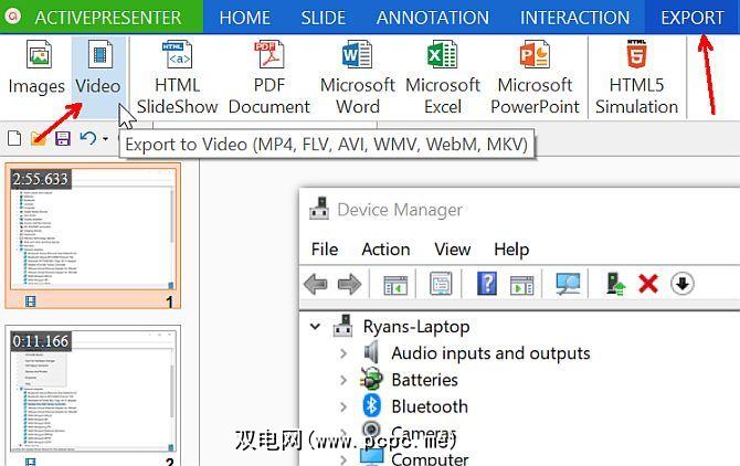完成所有场景的录制后,单击导出菜单,然后单击视频图标。