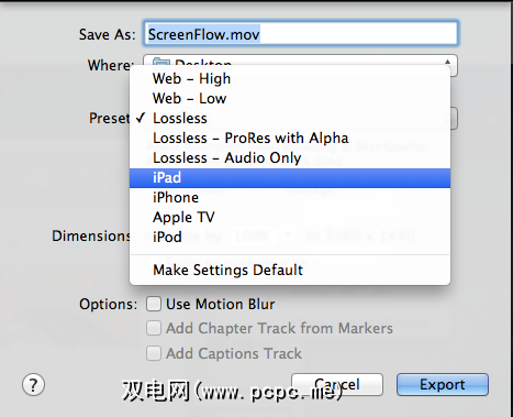 完成截屏后,ScreenFlow可以轻松将制作的作品导出到YouTube,Vimeo,Facebook页面, Google云端硬盘或QuickTime,Windows Media Video或Flash格式的高质量视频文件。还提供了预设的导出设置,用于优化您的Web,iPhone,iPad和Apple TV的制作。