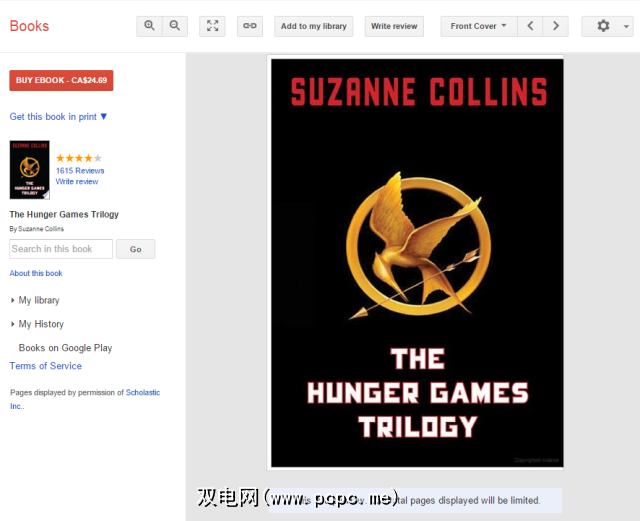 例如,如果您想品尝Suzanne Cullins的 The饥饿游戏,您可以在“饥饿游戏三部曲Google图书记录"中阅读三部曲几章的几页内容。