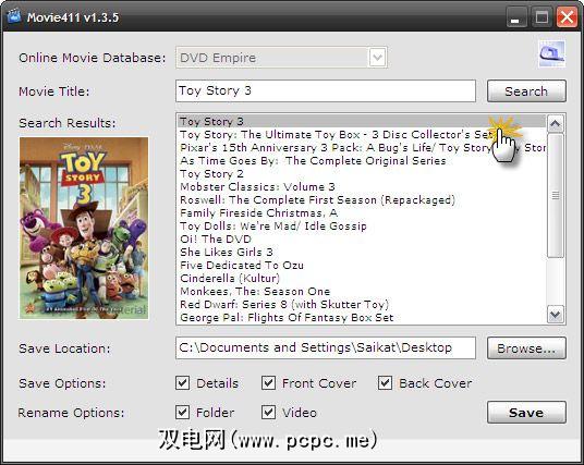 使用Movie411就像输入电影名称并单击 Search 一样简单。该软件使用DVDEmpire.com上的索引在搜索结果中提供匹配的标题。现在,您所要做的就是在匹配列表中滚动并选择所需的匹配。您可以从封面的缩略图预览中查看您的选择是否正确。