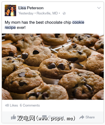从“ Cookie食谱"开始,您可能会发现一些有用的东西,但是加上您认为可能有用的人的名字,然后突然发现金子。 Facebook知道您所说的“丽莎"是您的朋友丽莎,而不是其他随机人,因此结果是您最初看到的确切帖子。和食谱。