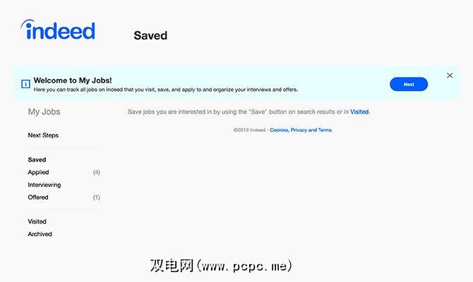 在那里,您可以跟踪已保存的职位(又称您要稍后查看的职位信息),已申请的职位,当前正在面试的职位或表上的任何报价。