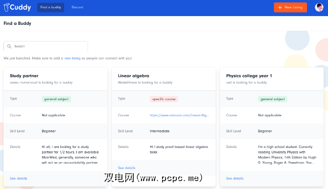 单击“查找好友"以查看正在寻找不同类型合作伙伴的人员列表。有些有特定的课程要求,而另一些则对普通学习伙伴感兴趣,而与科目无关。您会发现诸如类型,技能水平,课程链接和一般说明之类的详细信息。